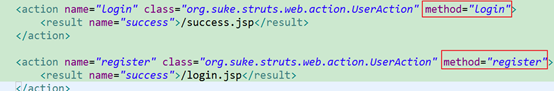在上面的配置文件中,可以看到配置文件中分别定义了两个action元素,每个action元素的name属性是不同的,但是其指向的实现类的引用却是相同的.那么,Struts2在接收请求后通过method属性,