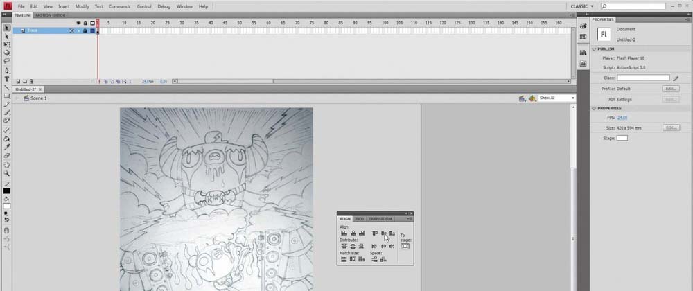 1、在Flash中打开一个新的文件。在属性窗口(命令/按Ctrl + F3 ),单击编辑按钮,并设置大小为420 X594毫米。现在进口的项目文件(基地跟踪文件ht_trace.jpg选择)文件>导入>导入到舞台(命令/按Ctrl + R ),并选择导入的图像。在对齐窗口(窗口>对齐>为了舞台),选择对齐水平居中对齐,并垂直居中。