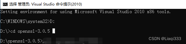 3)用管理员身份打开Visual Studio的开发人员命令提示,并进入openssl的目录。