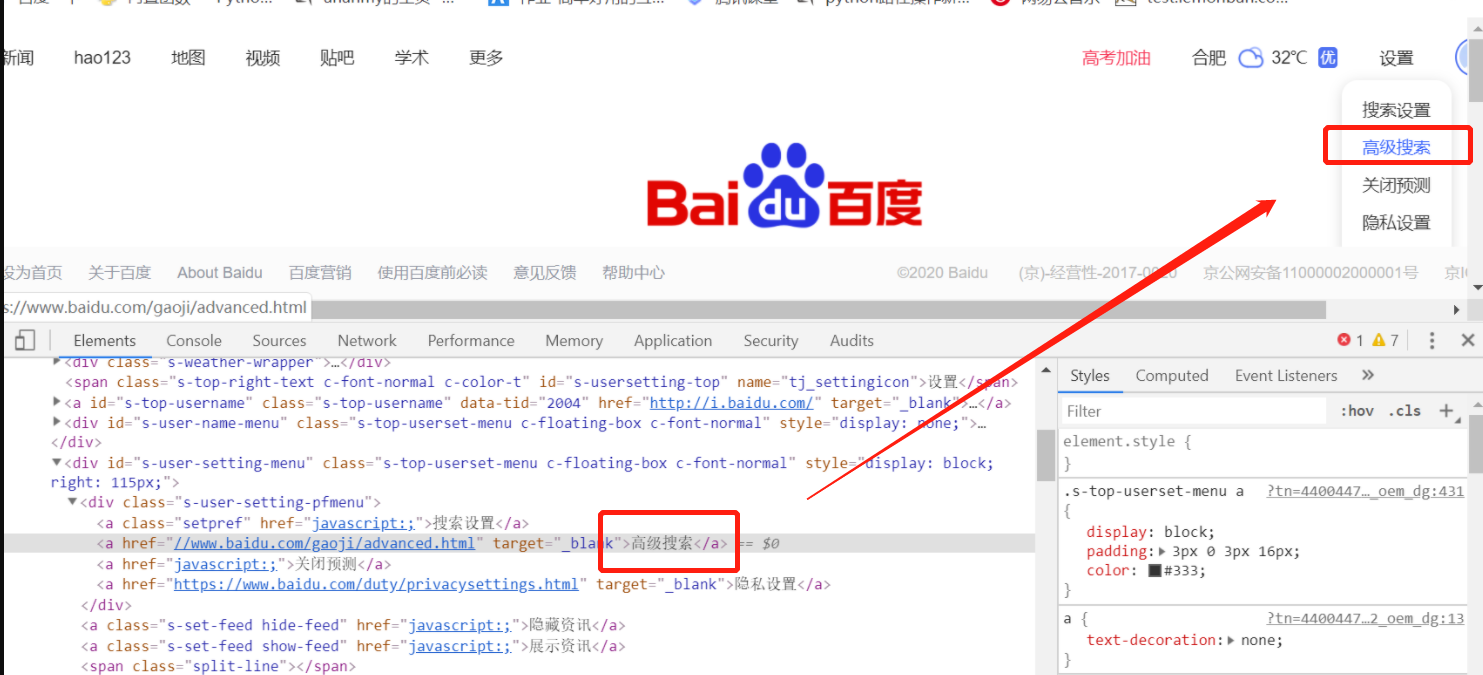 比如,在百度页面点击 设置按钮,如下: