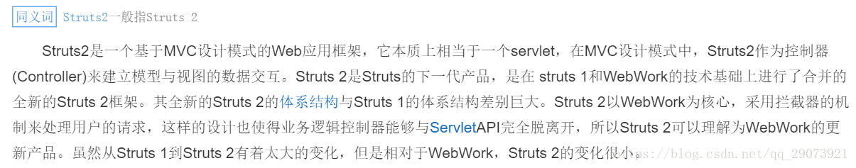 Struts2是一个基于MVC设计模式的Web应用框架,它本质上相当于一个servlet,在MVC设计模式中,Struts2作为控制器(Controller)来建立模型与视图的数据交互。