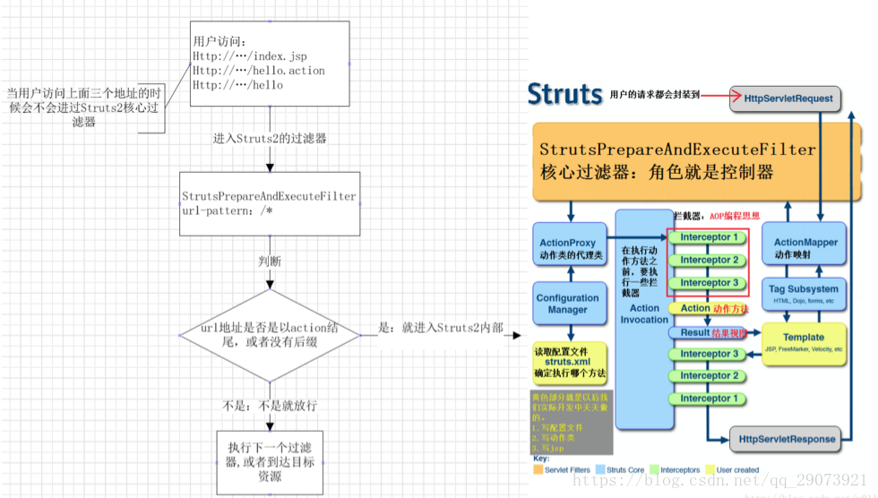 是由传统Struts1和WebWork两个经典框架发展而来,但主要核心还是Webwork。采用拦截器的机制来处理用户的请求,使业务逻辑控制器与Servlet API完全脱离开。