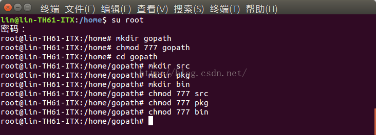 在/home目录下, 建立一个名为gopath(名字任意)的目录,在该目录中建立三个子目录(名字必须为src、pkg和bin)。创建目录过程如下图所示: