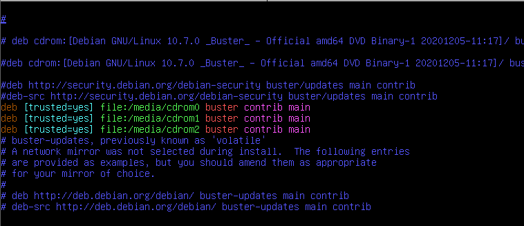deb [trusted=yes] file:/media/cdrom1 buster contrib main