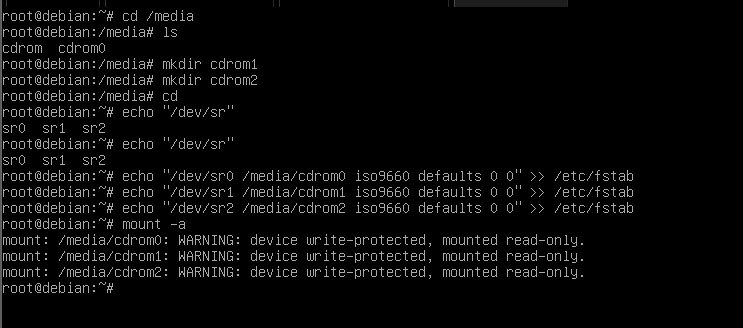 root@debian:~# echo "/dev/sr2 /media/cdrom2 iso9660 defaults 0 0" >> /etc/fstab