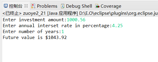 以上就是专一水壶最近收集整理的关于金融运用:计算未来投资回报 编写程序,读取投资总额、年利率和年数,然后使用下面的公式显示投资回报金额。Java中控制输出小数位数 的三种写法的全部内容,更多相关金融运用:计算未来投资回报 编写程序,读取投资总额、年利率和年数,然后使用下面的公式显示投资回报金额。Java中控制输出小数位数内容请搜索靠谱客的其他文章。