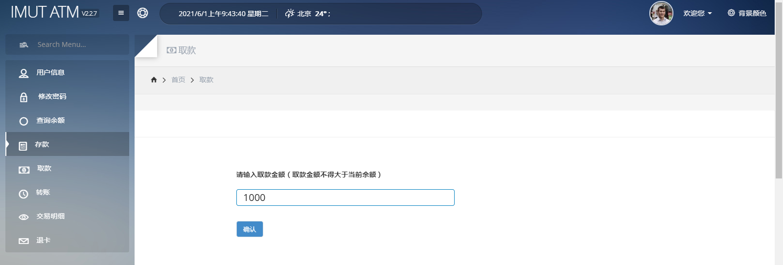 本系统仿照银行ATM取款机的功能,通过WEB的形式进行开发实现,功能完整,界面简洁大方,并可通过CSS自由切换系统背景界面风格,比较适合作课程设计或期未作业使用。