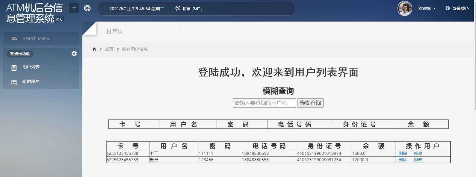 银行卡用户列表:可以实现模糊搜索