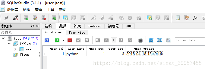 执行完成之后,可以发现在当前目录下会生成一个test.db的数据库文件。可以通过SQLite Studio来查看SQLite数据文件,该软件不需要安装,解压之后就可以使用