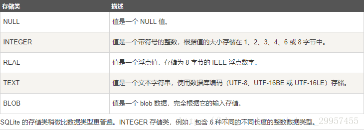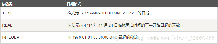 注意:在SQLite中没有一个单独用来存储日期和时间的存储类,我们可以把日期和时间存储为TEXT、REAL、INTEGER类型。