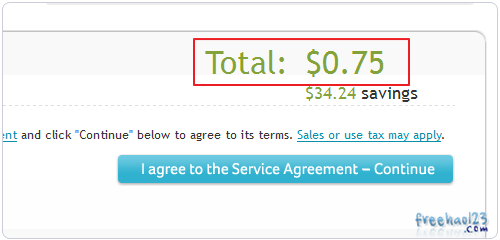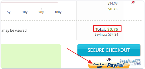 7、确定后,你会发现使用优惠码后域名的价格已经变成了0.75美元一年了。可以用Paypal付款。