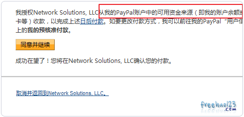 2、注意这里Network Solutions要求我们同意Paypal从余额或者信用卡中自动扣款的协议,点击“继续”。