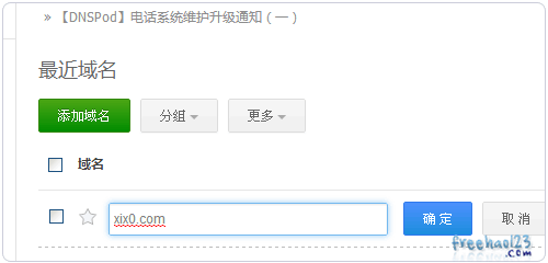 5、我这里使用的是国内第三方免费DNS服务:DNSPOD。先在DNSPOD中添加域名。