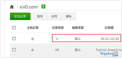 4、再到DNSPOD那里做A记录,记录值就是空间的IP地址,稍等一会儿就可以访问了。