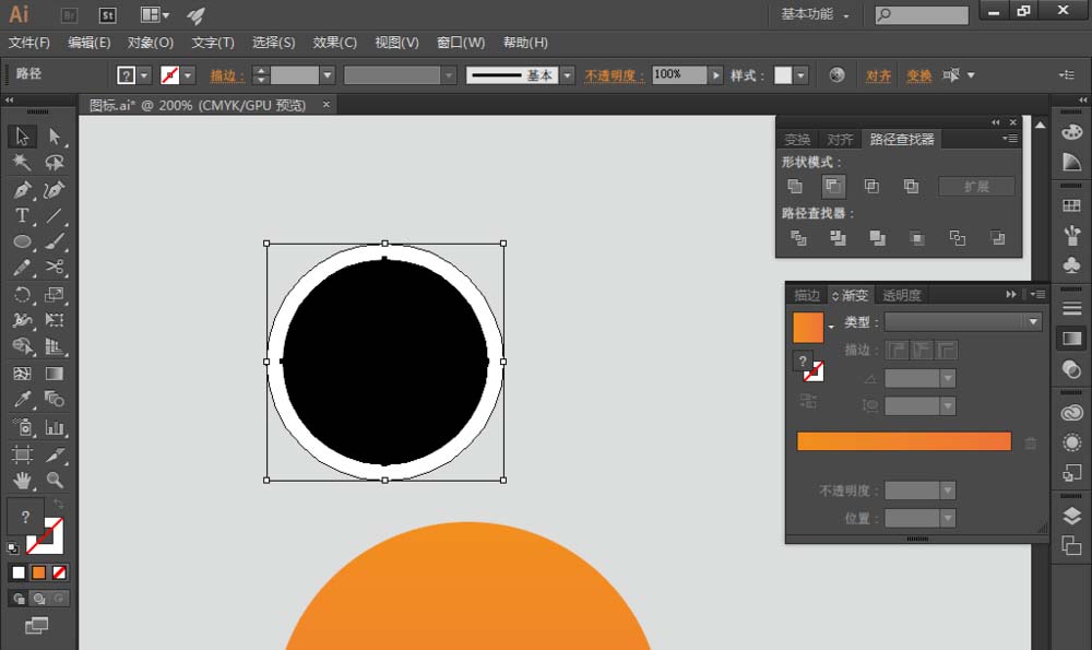 2、选择【椭圆工具】,首先创建一个的圆,在里面创建一个小圆,在复制一个小圆,先放一边不管。 在【路径查找器】中的选择【减去顶层】,创建一个圆环,如图: