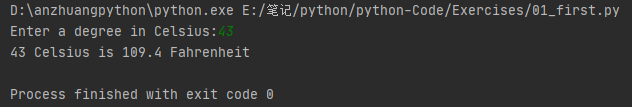执行目标: Enter a degree in Celsius:43 43 Celsius is 109.4 Fahrenheit