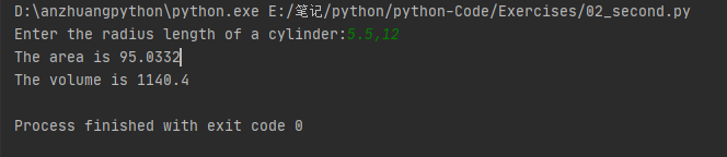 Enter the radius length of a cylinder:5.5,12 The area is 95.0331 The volume is 1140.4