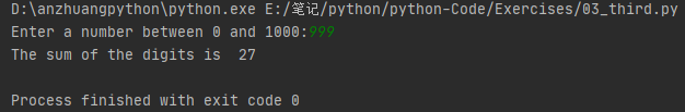 执行目标: Enter a number between 0 and 1000 :999 The sum of the digits is 27