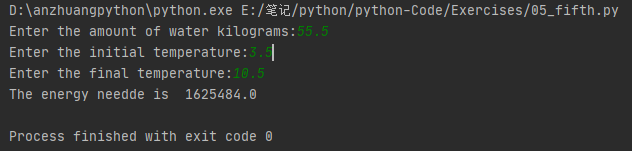 执行标准: Enter the amount of water in kilograms:55.5 Enter the initial temperature:3.5 Enter the final temperature:10.5 The energy needed is 1625484.0