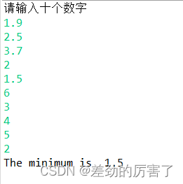 编写一个测试程序,提示用户输入10个数字,调用这个方法返回最小值,并显示最小值,下面是程序运行示例: