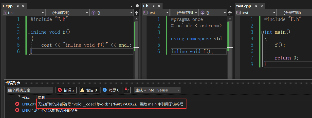 编译时会将 F.h 中的声明拷贝到 test.cpp 中,此时 test.cpp 中只有内联函数 f 的声明,没有内联函数 f 的定义,于是便无法将 f 函数展开(.cpp 文件是单独编译的),并且由于内联函数会展开,所以内联函数 f 并不会在 test.cpp 的符号表中产生,也就导致在链接时合并符号表后无法找到函数 f