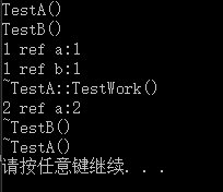 2、ptr_a 和ptr_b在main函数中退出前,引用计数均为1,也就是说,在TestA和TestB中对std::weak_ptr的相互引用,不会导致计数的增加。在TestB析构函数中,调用std::shared_ptr<TestA> tmp = m_TestA_Ptr.lock(),把std::weak_ptr类型转换成std::shared_ptr类型,然后对TestA对象进行调用。