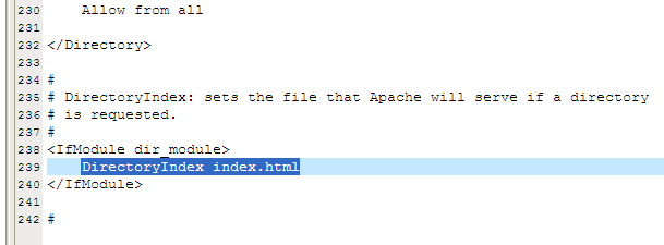查找关键字,DirectoryIndex(目录索引,也就是在仅指定目录的情况下,默认显示的文件名),可以添加很多,系统会根据从左至右的顺序来优先显示,以单个半角空格隔开,比如有些网站的首页是index.htm,就在光标那里加上“index.htm”文件名是任意的,不一定非得“index.html”,比如“test.php”等,都可以。