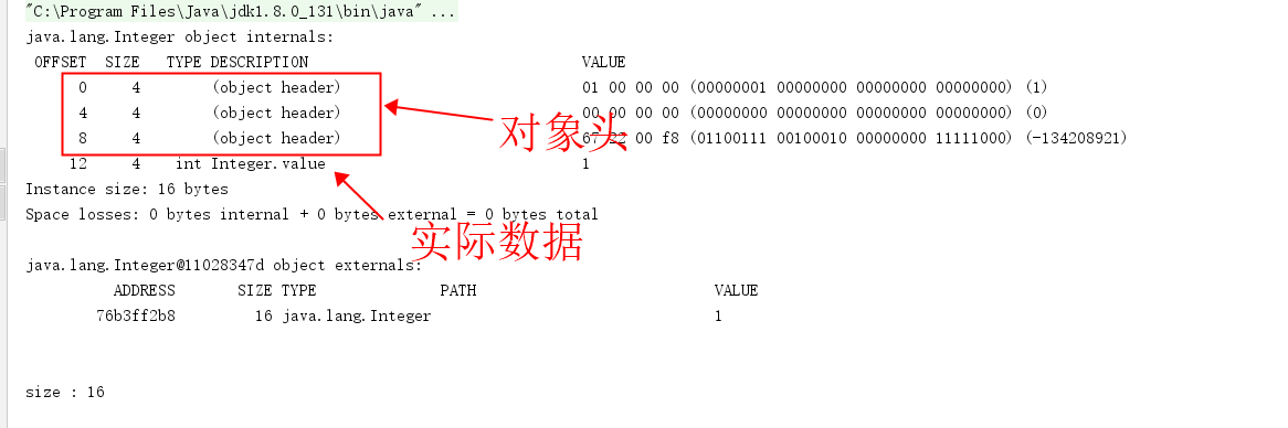 可以看出总共占用16字节,其中对象头信息占用了12字节,int对象占用了4个字节。java基本类型的内存占用情况:
