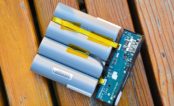 将小米移动电源顶盖和底盖都拆解后,我们取出小米移动电源内部主体了,小米移动电源内部也比较简单,主要有四款1850电芯和一块主板构成,如下图所示: