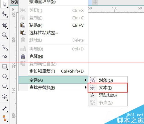 9、再点击子菜单“全选”——“文本”;