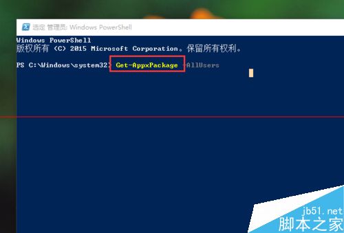 3、在接下来打开的Powershell命令窗口中,点击输入以下命令程序:Get-AppxPackage -AllUsers 然后回车,电脑系统将自动列出所安装的全部应用。
