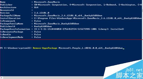 7、在Powershell程序窗口命令中,输入Remove-AppxPackage PackageFullName,后面的PackageFullName就是我刚才说过的完整包名称,如果你要卸载人脉应用。需要输入:Remove-AppxPackage Microsoft.People_1.10241.0.0_x64__8wekyb3d8bbwe。