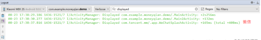 另外也可以根据系统日志来统计启动耗时,在Android Studio中查找已用时间,必须在logcat视图中禁用过滤器(No Filters)。因为这个是系统的日志输出,而不是应用程序的。你也可以查看其它应用程序的启动耗时。