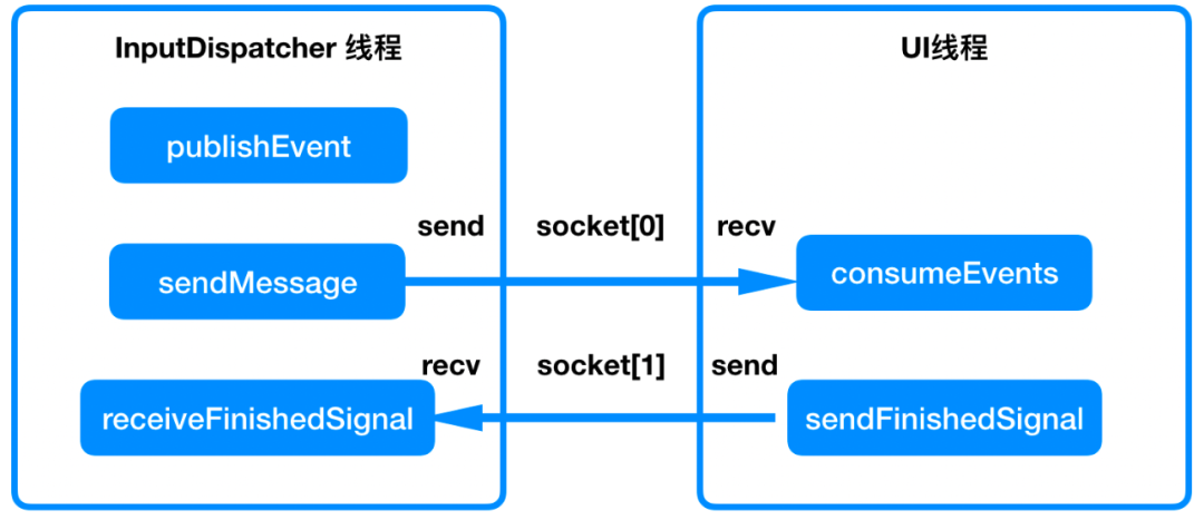 熟悉input系统的同学应该知道,Touch事件最终是通过server端的InputDispatcher线程传递给Client端的UI线程的,并且使用的是一对Socket进行通讯的。我们可以通过PLT Hook,去Hook这对Socket的send和recv方法来监控Touch事件啊!我们先捋一下一次Touch事件的处理过程: