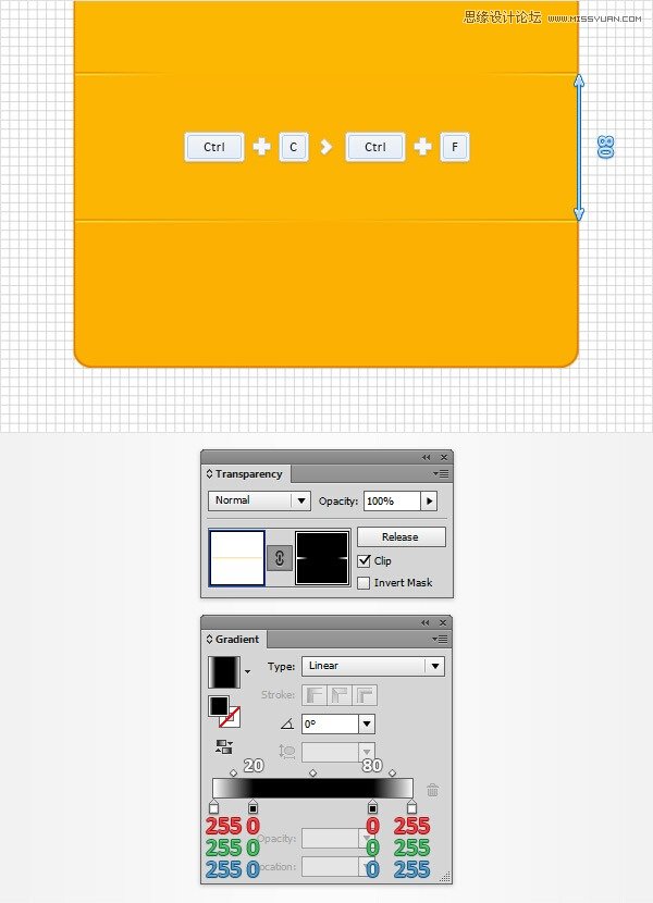 ④ 复制你的蒙版路径(Ctrl-C>Ctrl-F),选择复制将它向上拖动80像素。请确保您的副本保持选中,注意看透明度面板上选择遮罩,并与如下图所示的取代现有的线性渐变。请记住,从渐变图像的白色数字代表位置百分比。你的新路径看起来应该如下图。