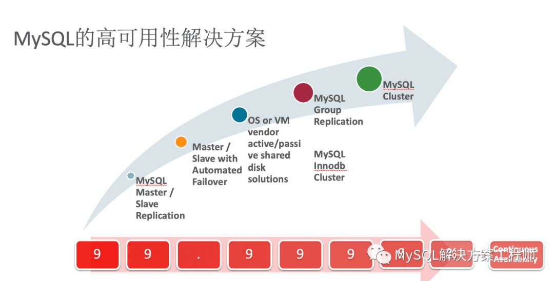 MySQL的高可用性解决方案目前大致分为5种,按照高可用的级别(99.9999%为最高级)排序依次为,主从复制、具有自动故障转移功能的主从复制、利用共享存储、OS 或虚拟化软件实现主备架构、MySQL Group Replication 群组复制,以及 MySQL NDB Cluster。