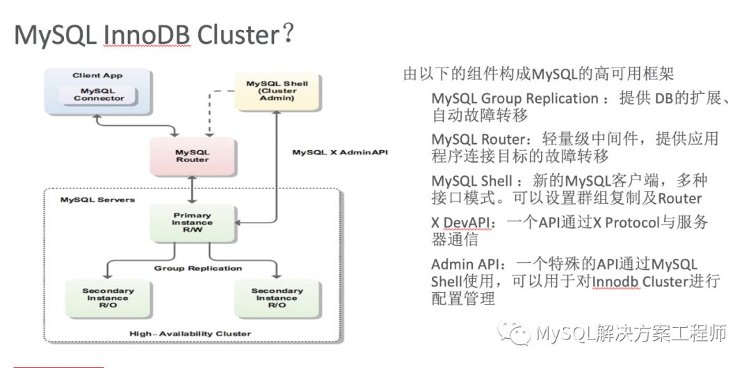 MySQL InnoDB Cluster是一个高可用的框架,它由下面这几个组件构成: