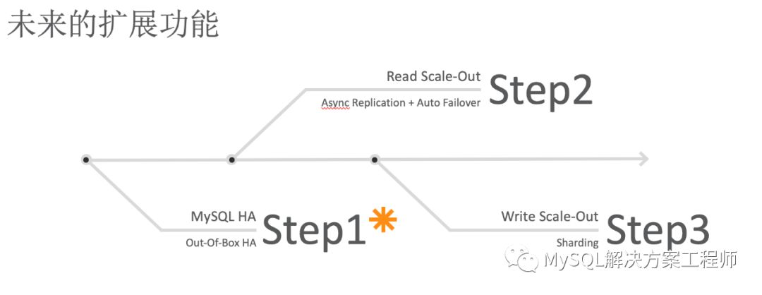 InnoDB Cluster 目前已经实现了发展路线图的第一步——高可用性,将来的发展方向为自动读取扩展和自动写入扩展。最终实现如下图的最终目标: