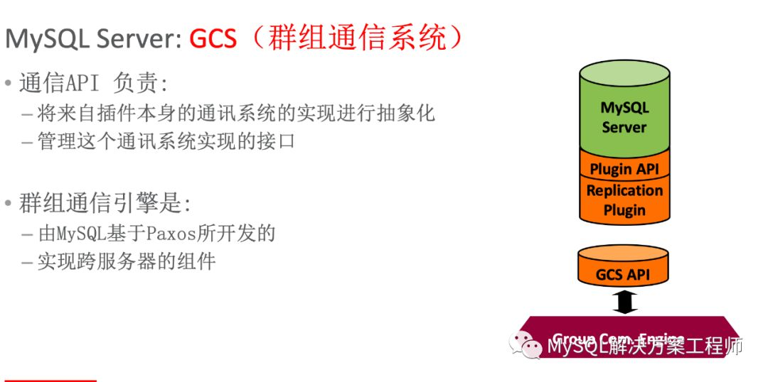 GCS API将通信系统的实现进行抽象化,并管理这个接口。通信引擎是基于Paxos开发的,是实现跨服务器的组件。