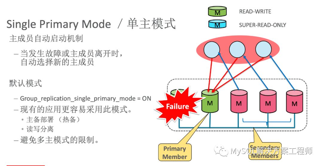 该模式下,单个MySQL实例作为数据写入的主节点,其它的节点用于热备。这个模式与传统的主从模式相似,便于现有系统进行切换。