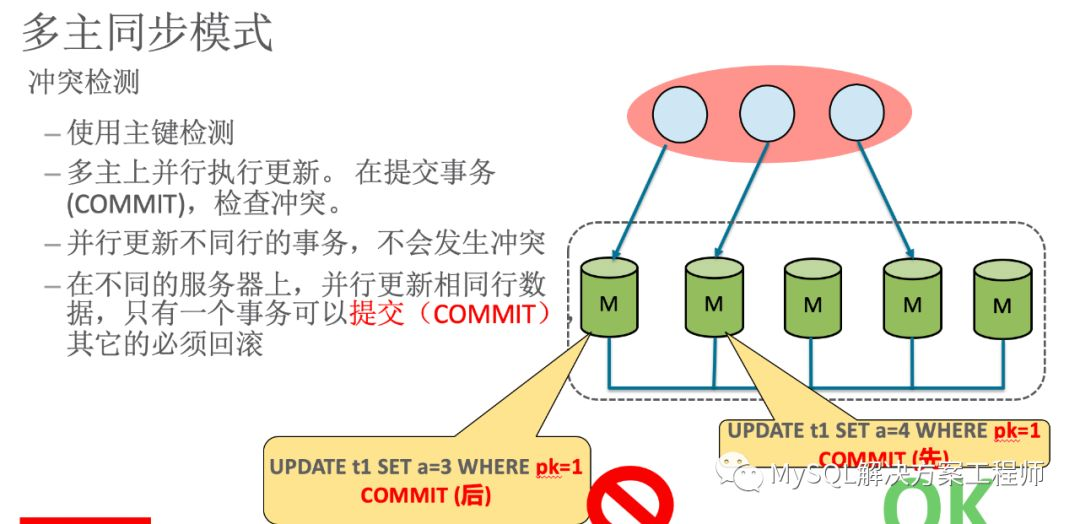使用多主模式时,由于数据的写入可以在所有的成员节点上进行,当在不同成员上对同一条记录同时进行更新时,就会产生冲突,此时群组复制会根据成员提交的先后次序(严格来讲是在群组复制的一致性校验阶段,取得校验成功的先后次序)进行判断,后提交事务的执行回滚处理。