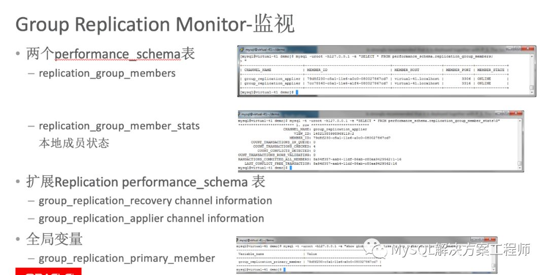 当配置好MGR以后,需要对其进行监视和管理,通过perforamnce_shcema里面的表和全局变量可以确认MGR的成员状态,当前主成员等必要信息。
