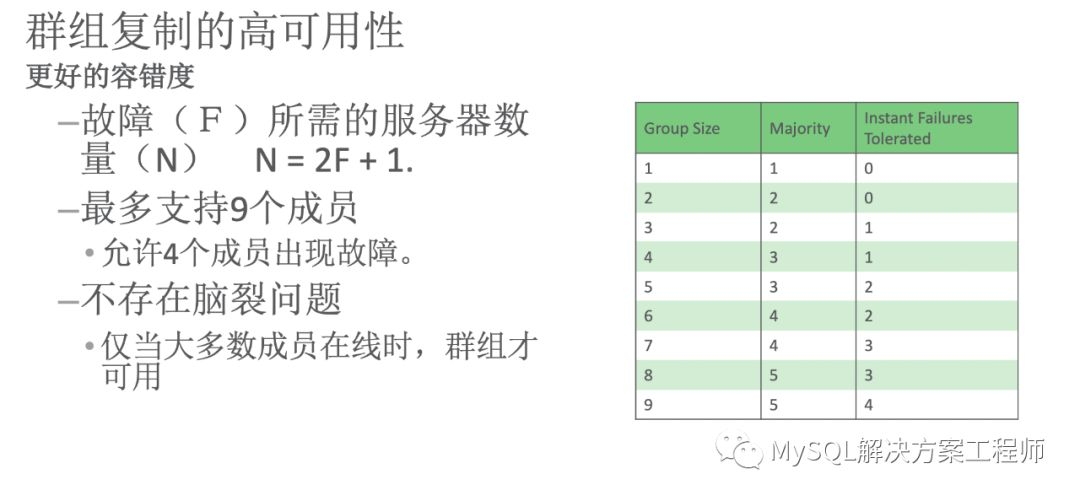 群组复制的特性之一是提供高可用性,具有更好的容错度。每个群组最多具有9个成员(推荐使用不超过7个,最低使用3个。)