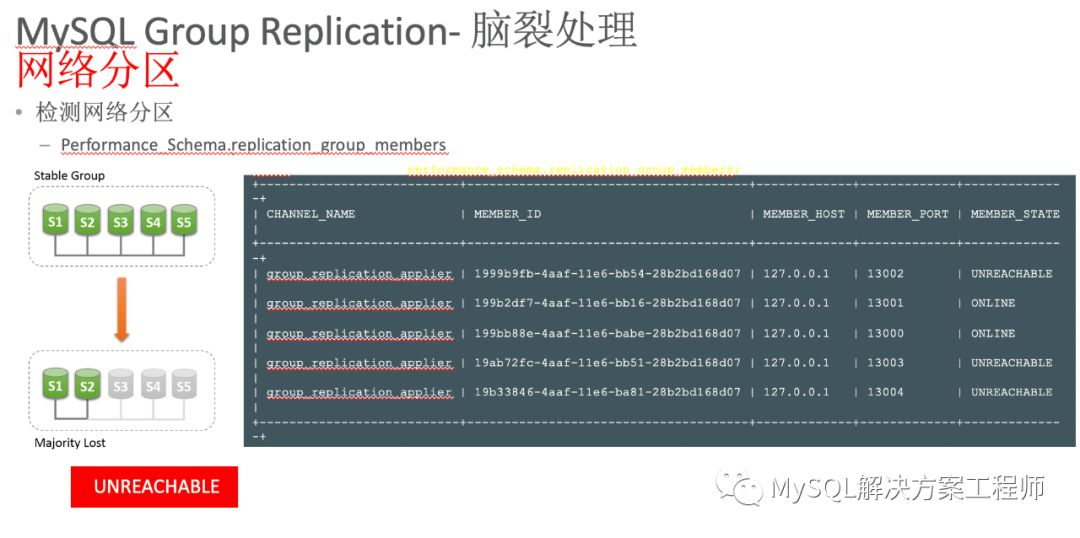 使用 MGR 不会出现脑裂问题,MGR 会检测网络分区。