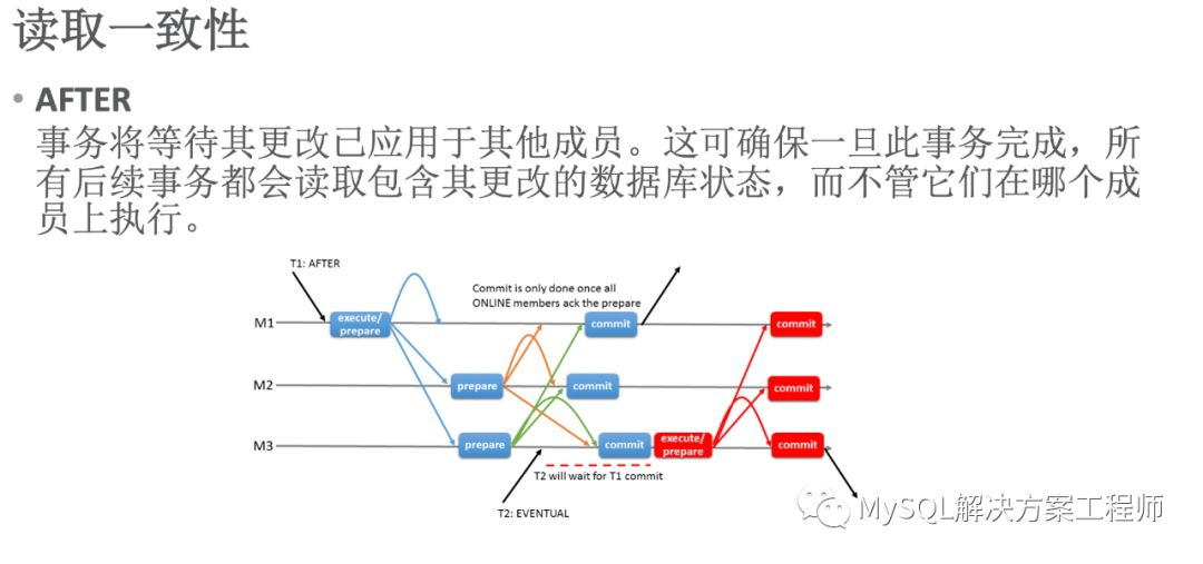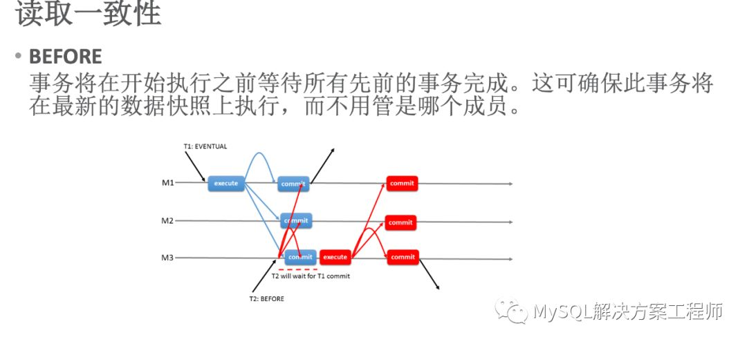 当变量值设置为 BEFORE 时,上图中 T2 使用该值,T2 在 M3 上提交时,需要等待 T1 在全部成员上执行完毕才可以执行(T2 要等待之前的事务 BEFORE在全部成员上执行完毕)