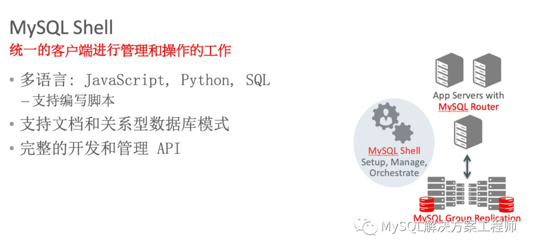 接下来介绍一下 MySQL Shell。Shell 是MySQL团队打造的一个统一的客户端,它可以对 MySQL 执行数据操作和管理。它支持通过 JavaScript,Python,SQL 对关系型数据模式和文档型数据模式进行操作。使用它可以轻松配置管理 InnoDB Cluster。