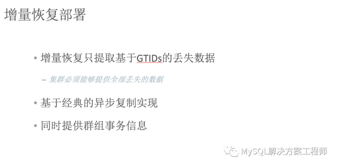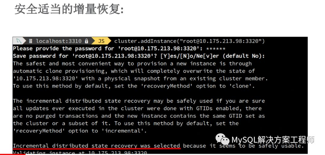 增量恢复可能会需要相当长的时间,并且当群组无法提供全部的 binlog 时,无法进行恢复。