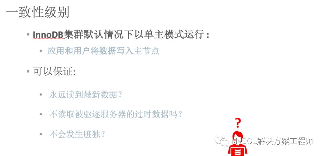MGR 是通过日志的传播和施放来进行群组内所有成员的数据同步,因此,在某一时间点各个成员上数据是会出现不一致的情况(最终会一致)。在MySQL 8.0.14 之后,可以通过使用变量 group_replication_consistency 精确地控制每个节点上数据的一致性。