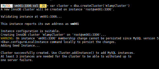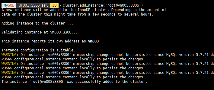 cluster.addInstance('root@vm003:3306')