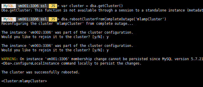 mysql-js> dba.rebootClusterFromCompleteOutage('mlampCluster')